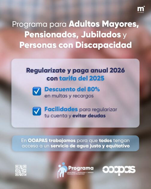 Morelia, Michoacán; 1° de marzo de 2026.– El Organismo Operador de Agua Potable, Alcantarillado y Saneamiento de Morelia (Organismo Operador de Agua Potable, Alcantarillado y Saneamiento de Morelia) pondrá en marcha durante el mes de marzo el Programa para Adultos Mayores, Pensionados, Jubilados y Personas con Discapacidad, con el objetivo de apoyar la economía de los sectores más vulnerables del municipio.