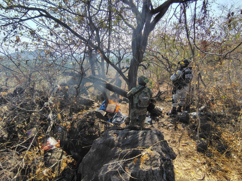 En un segundo suceso en la localidad de La Huerta de este municipio, los efectivos de las fuerzas estatales y federales, localizaron un puesto de observación ilícito, presuntamente utilizado por miembros de una celula delincuencial; sitio que fue asegurado y posteriormente incinerado.