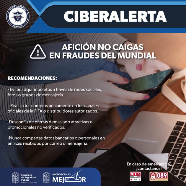 *Morelia, Michoacán a 24 de septiembre 2025.- Labores de cibervigilancia efectuadas por elementos de la Secretaría de Seguridad Pública (SSP), se descubrieron distintas modalidades de fraudes alusivas a la venta en Michoacán de boletos para el Mundial de Fútbol que va realizarse en México en el año 2026.
