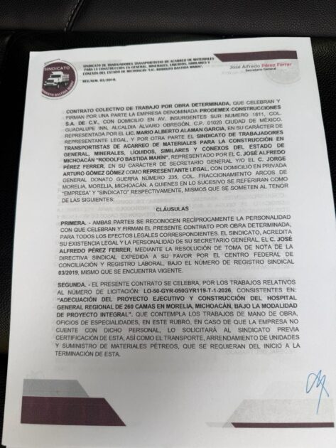 El dirigente afectado mostró documentación oficial que acredita el acuerdo con Prodemex, subrayando que su sindicato es el único facultado legalmente para participar en esta etapa del proyecto.