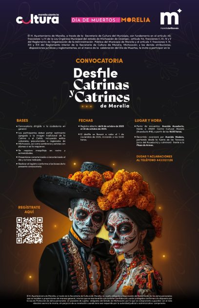 Morelia, Michoacán; 24 de octubre de 2025.- El Gobierno de Morelia que encabeza el presidente municipal, Alfonso Martínez Alcázar, por medio de la Secretaría de Cultura (Secultura) reitera la invitación a la ciudadanía en general para participar en la edición 2025 del Desfile de Catrinas y Catrines, que se realizará el próximo primero de noviembre en el centro histórico.
