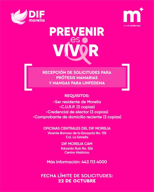 El DIF Morelia recuerda que la prevención es la herramienta más poderosa: detectado en etapas tempranas, el cáncer de mama tiene más del 90% de probabilidades de supervivencia. La invitación es a realizar revisiones periódicas y aprovechar los servicios gratuitos que se ofrecen en este mes. Para mayor información, comunicarse al teléfono: 443 113 4000.