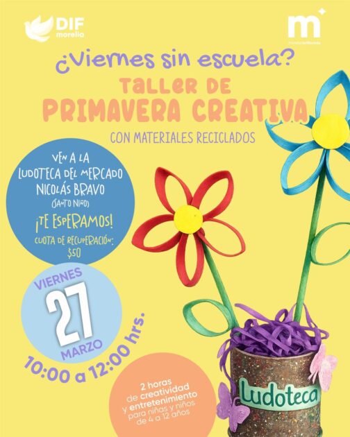 Morelia, Michoacán; 25 de marzo de 2026.- Con el objetivo de brindar una alternativa segura y formativa para madres y padres de familia durante los días sin clases, la presidenta honoraria del DIF Morelia, Paola Delgadillo Hernández, invita a inscribir a niñas y niños en el taller “Primavera Creativa: Flores con Material Reciclado”, que se realizará este viernes en las ludotecas municipales.