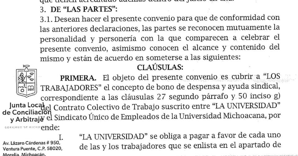 De acuerdo con el convenio, en total la Universidad Michoacana se compromete a pagar 68 millones 135 mil pesos, suma de la Ayuda Sindical y Bono de despensa para los suemistas, recursos que fueron gestionados por el líder Eduardo Tena y otorgados por el gobierno estatal a la Universidad Michoacana.