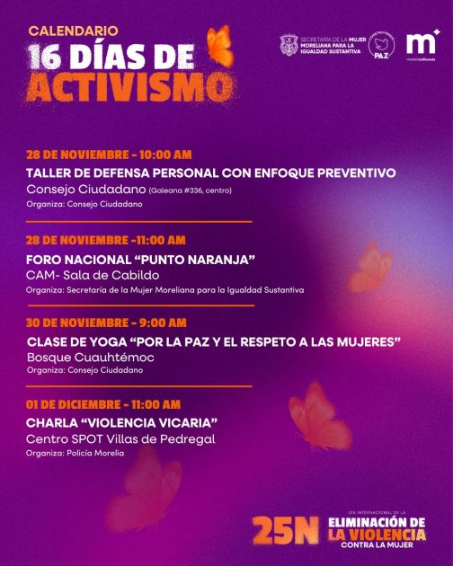 Coordinada por la Secretaría de la Mujer Moreliana para la Igualdad Sustantiva (Semmujeris) y diversas dependencias municipales, la agenda contempla actividades del 21 de noviembre al 16 de diciembre, entre talleres, conferencias, acciones de formación y ejercicios de reflexión comunitaria.