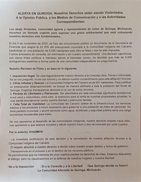 *Quiroga, Michoacán a 28 de noviembre 2025.- Habitantes de la comunidad El Calvario, de este municipio, denunciaron públicamente que jamás avalaron las determinaciones aprobadas por el Ayuntamiento de la administración pasada para otorgar presupuesto directo y funciones municipales a su localidad, y sostuvieron que esas decisiones se tomaron sin consulta ni consentimiento de la mayoría de la población.