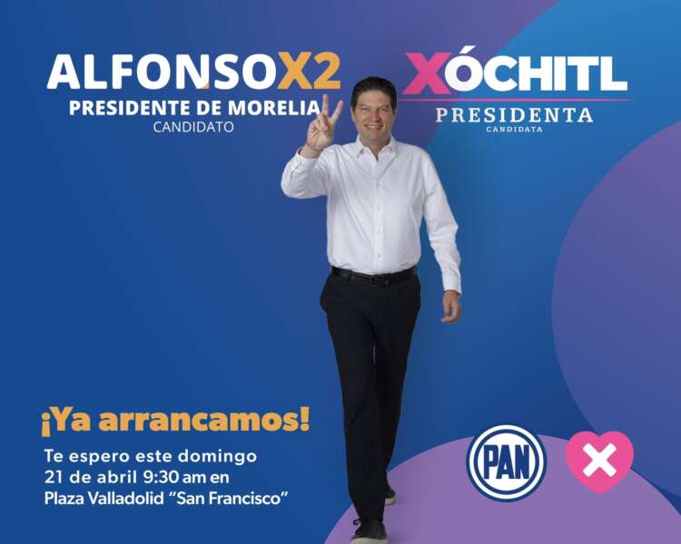 Morelia, Michoacán; 20 de abril de 2024.- Este próximo domingo, la Plaza Valladolid, en el Centro Histórico de Morelia, se convertirá en un escenario de fiesta con el arranque oficial de campaña del Presidente Municipal, Alfonso Martínez Alcázar, evento que tendrá como invitada principal a la candidata a la Presidencia de México, Xóchitl Gálvez.