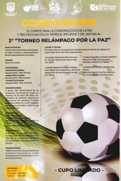 Morelia, Michoacán a 16 de abril de 2024.- El Comité para la Construcción de la Paz y Reconciliación de Morelia y el Gobierno Municipal a través del IMCUFIDE y el DIF, invitan al 2° Torneo Relámpago por La Paz, el cual inicia inscripciones desde hoy martes 16 de abril, hasta el 19 para que participen todos los equipos y ligas amateur, así como representativos de las escuelas públicas o privadas en ramas varonil y mixtos.