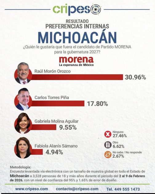 Morelia, Mich., a 13 de febrero de 2026.- Raúl Morón Orozco se perfila para ser el coordinador estatal de Defensa de la 4T en Michoacán, al registrar una ventaja de 2 a 1 en las preferencias sobre su más cercano rival, Carlos Torres Piña, de acuerdo a la encuesta más reciente de la firma Cripeso.