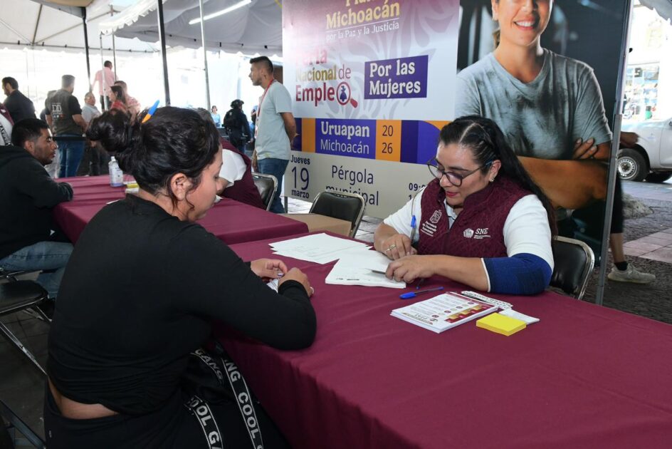 *Uruapan, Michoacán, 19 de marzo de 2026.- La Pérgola Municipal de Uruapan fue sede del arranque de las actividades de la Feria Nacional de Empleo para las Mujeres 2026, donde se instalaron módulos de reclutamiento empresarial y vinculación laboral. Además, el Servicio Nacional de Empleo (SNE) realizó entrevistas para el Programa de Trabajadores Agrícolas Temporales (PTAT).