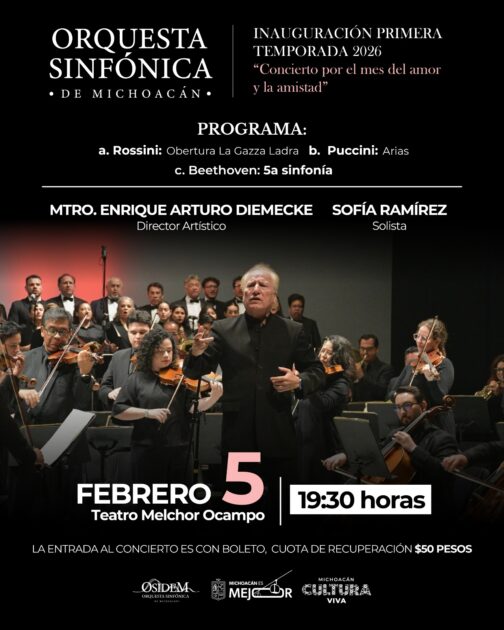 *Morelia, Michoacán, 29 de enero 2026.- La temporada 2026 de la Orquesta Sinfónica de Michoacán (Osidem), arranca con el “Concierto por el mes del amor y la amistad”, el jueves 5 de febrero a las 19:30 horas, en el Teatro Melchor Ocampo, bajo la dirección de Enrique Arturo Diemecke y con la participación de la soprano Sofía Ramírez.