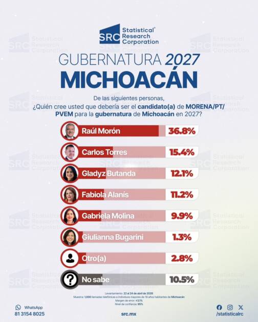 Morelia, Michoacán a 28 de abril de 2026.- De cara al proceso electoral de 2027, el panorama político en Michoacán arroja un claro favorito, Raúl Morón Orozco, esto de acuerdo a los datos más recientes de la casa encuestadora Statistical Research Corporation (SRC), que lo posiciona como el perfil que supera con amplitud a cualquier adversario de la oposición y consolida la continuidad de la Cuarta Transformación en la entidad.